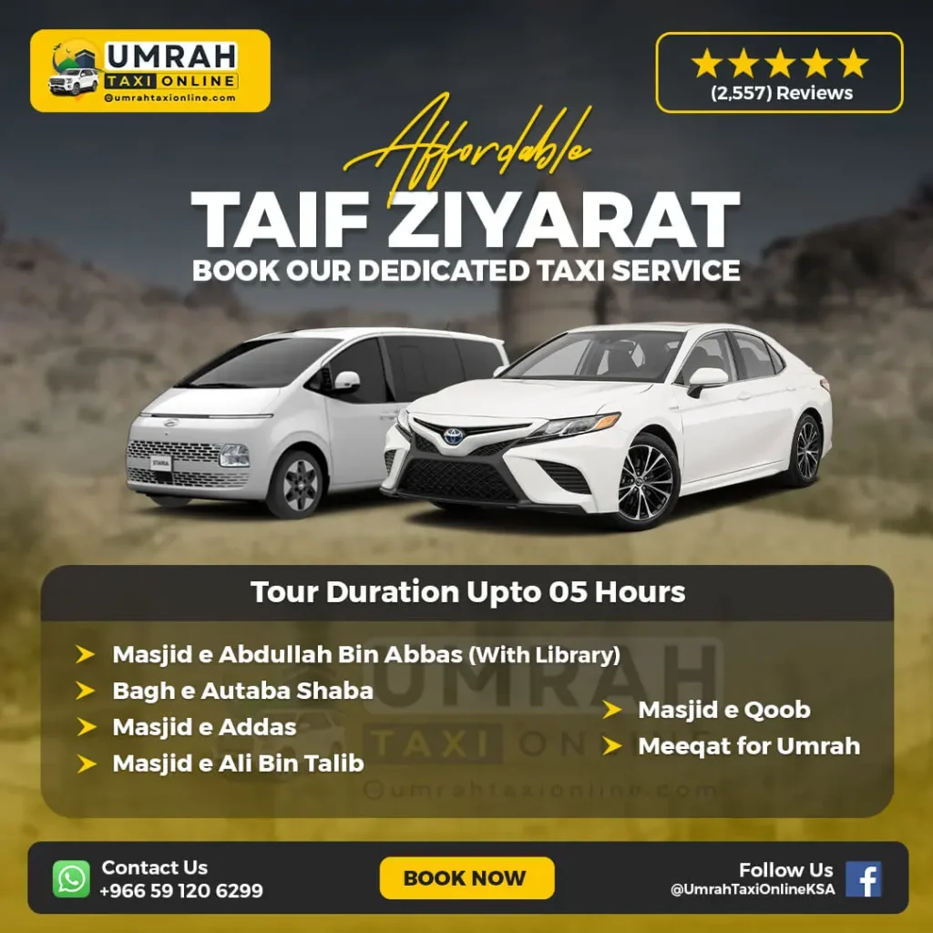 Planning to visit Taif during your Umrah or family trip? Umrah Taxi Online offers reliable Taif Ziyarat Taxi service with professional drivers, modern vehicles, and flexible packages. Whether you’re traveling from Makkah, or Jeddah, our private taxis ensure a smooth journey to explore the beauty and history of Taif.
